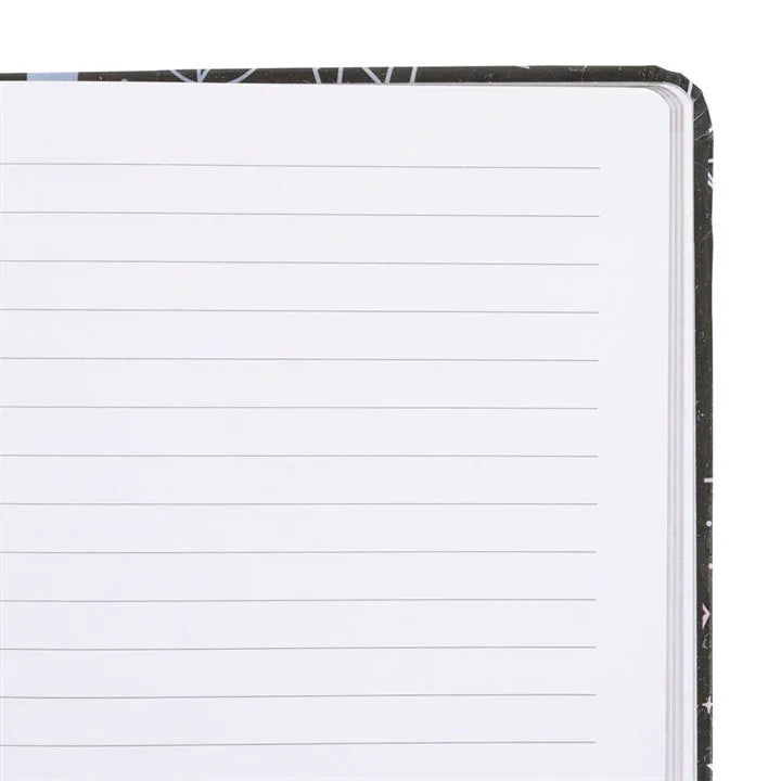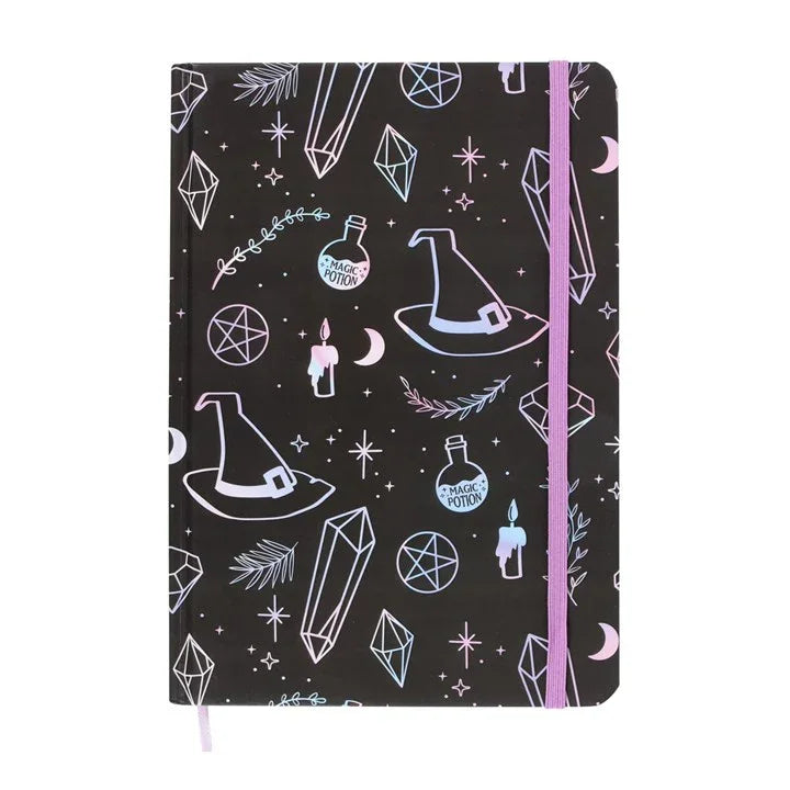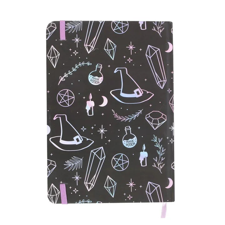 Whether used for notes, lists, or journaling, this beautiful A5 notebook will elevate your desktop with a mystical, holographic design of crystals, witch hats and potions. Perfect for a crystal collector or for anyone in touch with their witchy side, this notebook is accented by silver foil pages and a lilac ribbon marker. Includes 100 sheets / 200 lined pages.