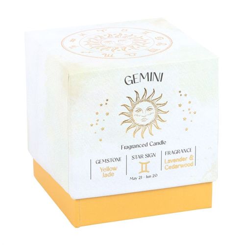 Bring power and positivity to individuals born between May 21 and June 20 with this stunning Gemini zodiac candle. A Lavender & Cedarwood fragrance is accented by a sprinkling of yellow jade chips that can later be reused for a multitude of spiritual purposes. Capturing the power of the sun, yellow jade is considered a good luck stone that amplifies Gemini's radiance and positivity. When faced with a difficult task, this gemstone will give Geminis a boost of energy and motivation to shine their brightest. Packaged in a matching sliding box that's perfect for gifting and display. Paraffin wax. Crystals will release from wax with use. Approximate burn time of 21 hours. Please practice caution when burning and never leave lit candle unattended. Designed by Something Different Wholesale and part of the Zodiac Crystal range of star sign and horoscope gifts.