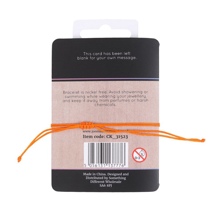 Balance and realign the sacral chakra with this orange string and metal charm bracelet. Presented on a matching backing card that reads, 'Creativity, sexuality, feelings, emotions, pleasure'. Product Dimensions: H1.9cm x W2.4cm x D0.8cm Packaged Dimensions: H2.3cm x W13cm x D2cm