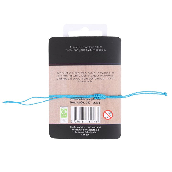 Balance and realign the throat chakra with this blue string and metal charm bracelet. Presented on a matching backing card that reads, 'Communication, expression, clarity, truth, purpose'. Product Dimensions: H1.9cm x W2.4cm x D0.8cm Packaged Dimensions: H2.3cm x W13cm x D2cm
